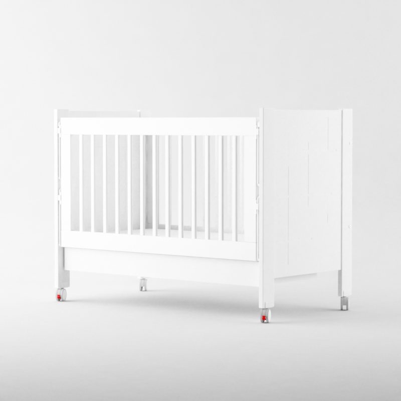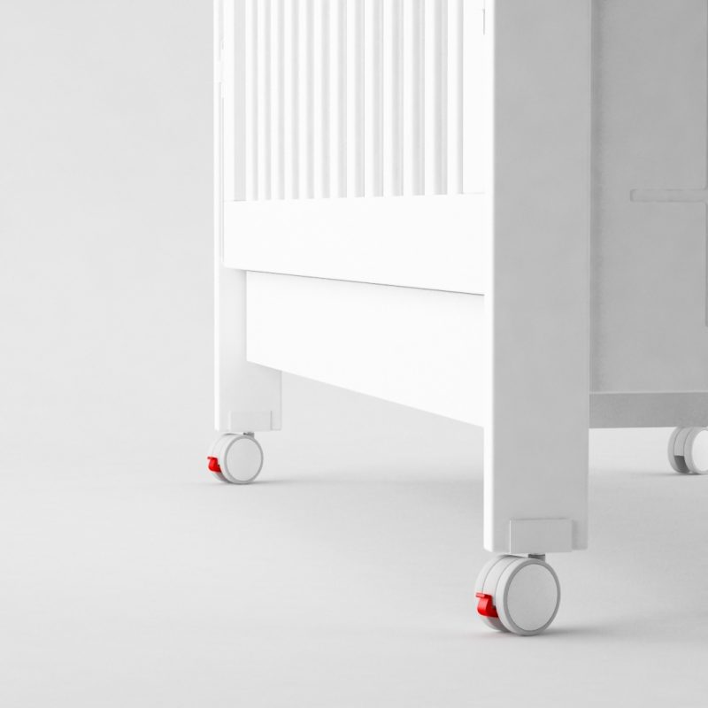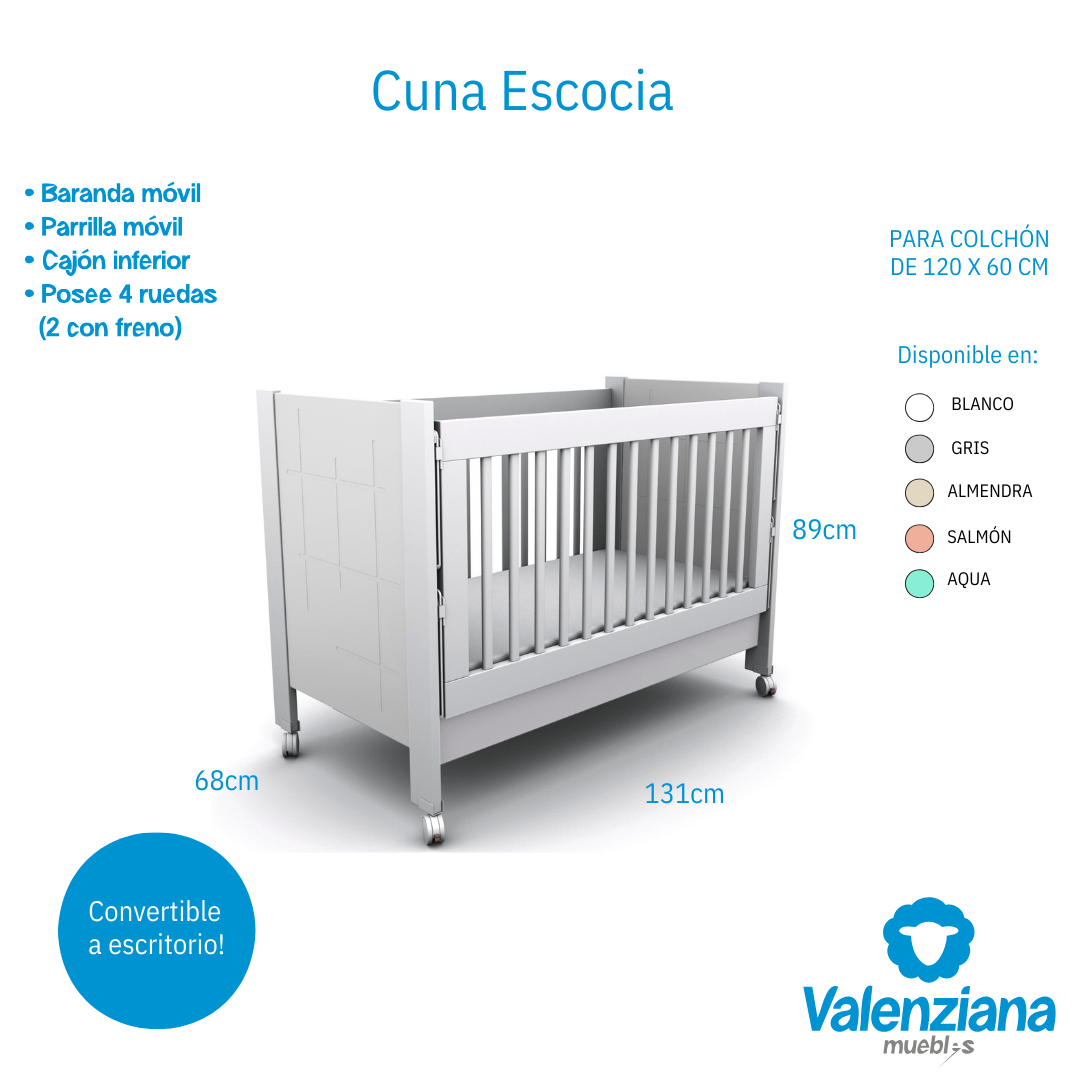 Posee 4 ruedas, 2 de ellas con freno. Se presenta en 5 colores. Posee un sistema de bajada de baranda de doble accionamiento de seguridad para el bebé. Cajón inferior con divisor con guías telescópicas.